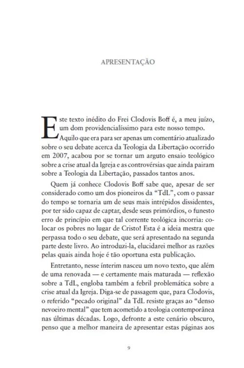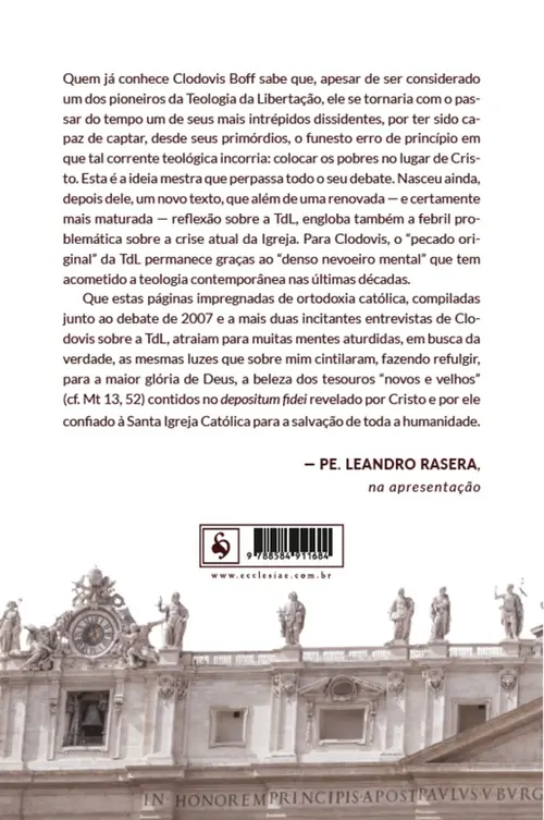 Quem já conhece Clodovis Boff sabe que, apesar de ser considerado um dos pioneiros da Teologia da Libertação, ele se tornaria com o passar do tempo um de seus mais intrépidos dissidentes, por ter sido capaz de captar, desde seus primórdios, o funesto erro de princípio em que tal corrente teológica incorria: colocar os pobres no lugar de Cristo. Esta é a ideia mestra que perpassa todo o seu debate. Nasceu ainda, depois dele, um novo texto, que além de uma renovada — e certamente mais maturada — reflexão sobre a TdL, engloba também a febril problemática sobre a crise atual da Igreja. Para Clodovis, o “pecado original” da TdL permanece graças ao “denso nevoeiro mental” que tem acometido a teologia contemporânea nas últimas décadas.