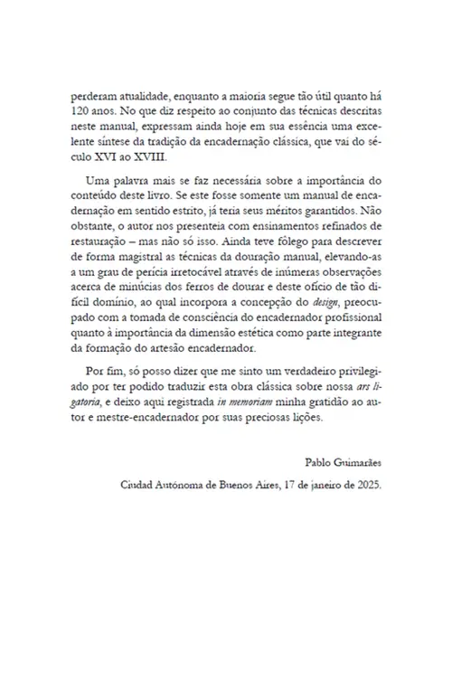 Livro incrivelmente atual, reúne instruções para a execução de diversas técnicas de encadernar livros de acordo com o cânone estabelecido na encadernação clássica. Destinado a bibliófilos, bibliotecários e encadernadores profissionais ou amadores, este manual contém as técnicas de encadernação e de reparos e conservação de livros, além de preciosas dicas e observações sobre a decoração de livros encadernados através da douração a punho, tudo descrito de maneira bastante minuciosa. O autor ainda enriqueceu este manual com valiosos co-mentários sobre os melhores tipos de couro e de papel usados em encaderna-ção. Além do conteúdo técnico, as lições vêm em muitos casos acompanhadas de uma perspectiva histórica que torna os temas abordados ainda mais interessantes. Trata-se realmente de um manual com abordagem profunda sobre as artes e ofícios da encadernação e matérias afins.