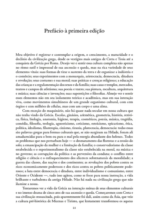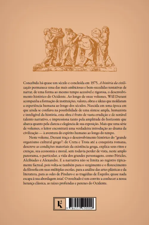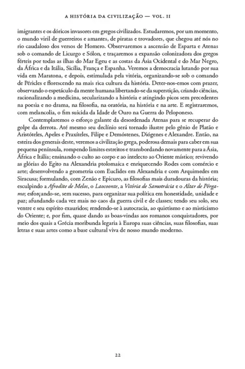 Durant traça o desenvolvimento histórico do “grande organismo cultural grego”: de Creta e Troia até a conquista romana, descreve as condições materiais da existência grega, explica seus ritos e crenças, sua economia e moral, sem todavia perder de vista, neste amplo panorama, o particular, a vida de grandes personagens. A narrativa não se limita ao registro tipicamente factual, pois volta-se também para o surgimento e o florescimento da filosofia em suas múltiplas escolas, para a análise das artes plásticas e da literatura, para as odes de Píndaro e as tragédias de Ésquilo.
