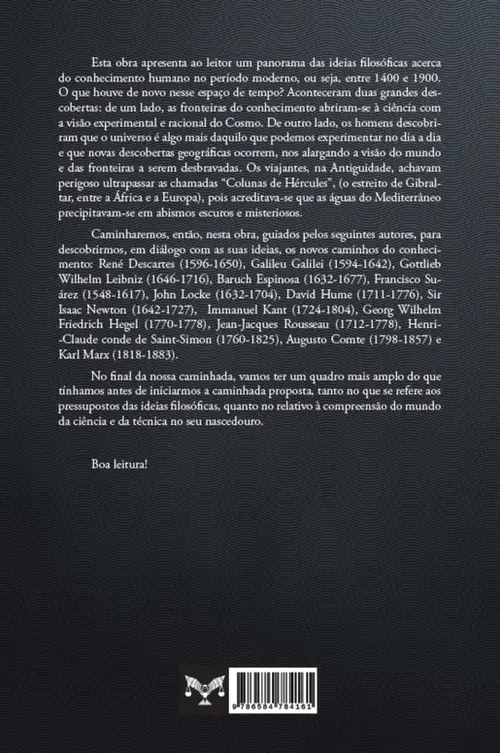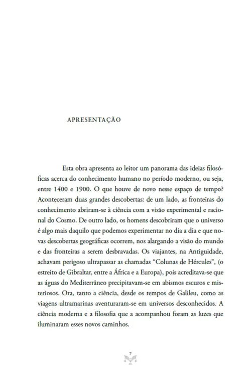Esta obra apresenta ao leitor um panorama das ideias filosóficas acerca do conhecimento humano no período moderno, ou seja, entre 1400 e 1900. O que houve de novo nesse espaço de tempo? Aconteceram duas grandes descobertas: de um lado, as fronteiras do conhecimento abriram-se à ciência com a visão experimental e racional do Cosmo. De outro lado, os homens descobriram que o universo é algo mais daquilo que podemos experimentar no dia a dia e que novas descobertas geográficas ocorrem, nos alargando a visão do mundo e das fronteiras a serem desbravadas. Os viajantes, na Antiguidade, achavam perigoso ultrapassar as chamadas “Colunas de Hércules”, (o estreito de Gibraltar, entre a África e a Europa), pois acreditava-se que as águas do Mediterrâneo precipitavam-se em abismos escuros e misteriosos.