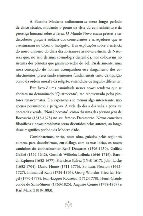 Caminharemos, então, nesta obra, guiados pelos seguintes autores, para descobrirmos, em diálogo com as suas ideias, os novos caminhos do conhecimento: René Descartes (1596-1650), Galileu Galilei (1594-1642), Gottlieb Wilhelm Leibniz (1646-1716), Baruch Espinosa (1632-1677), Francisco Suárez (1548-1617), John Locke (1632-1704), David Hume (1711-1776), Sir Isaac Newton (1642-1727), Immanuel Kant (1724-1804), Georg Wilhelm Friedrich Hegel (1770-1778), Jean-Jacques Rousseau (1712-1778), Henri-Claude conde de Saint-Simon (1760-1825), Augusto Comte (1798-1857) e Karl Marx (1818-1883).