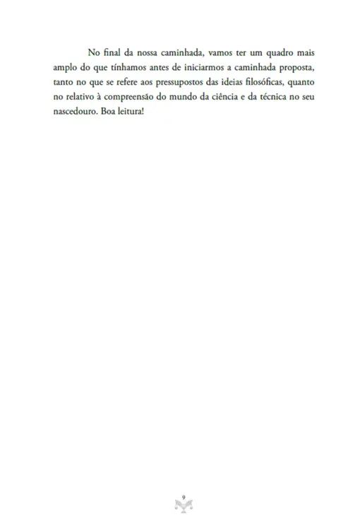No final da nossa caminhada, vamos ter um quadro mais amplo do que tínhamos antes de iniciarmos a caminhada proposta, tanto no que se refere aos pressupostos das ideias filosóficas, quanto no relativo à compreensão do mundo da ciência e da técnica no seu nascedouro.