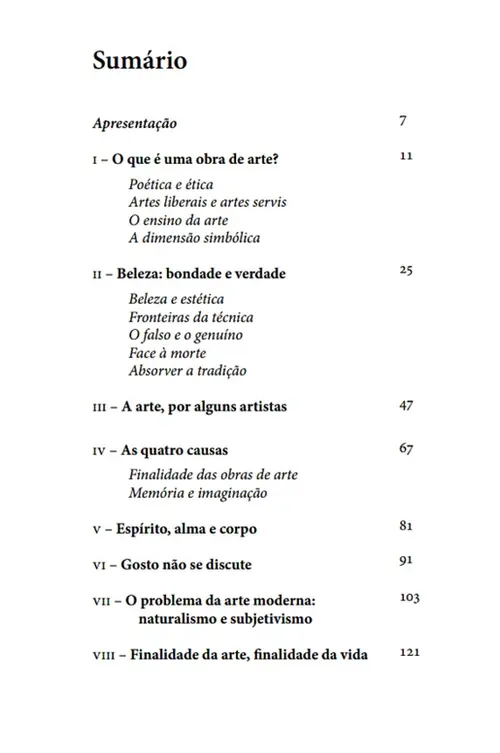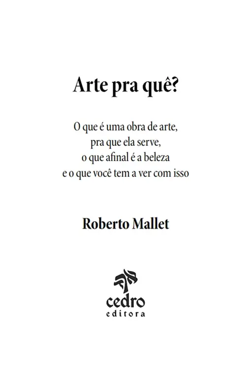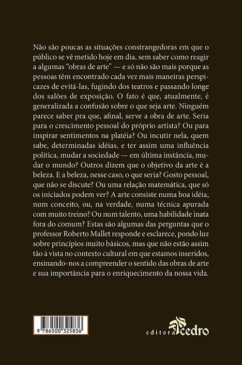 A arte consiste numa boa idéia, num conceito, ou, na verdade, numa técnica apurada com muito treino? Ou num talento, uma habilidade inata fora do comum? Estas são algumas das perguntas que o professor Roberto Mallet responde e esclarece, pondo luz sobre princípios muito básicos, mas que não estão assim tão à vista no contexto cultural em que estamos inseridos, ensinando-nos a compreender o sentido das obras de arte e sua importância para o enriquecimento da nossa vida.