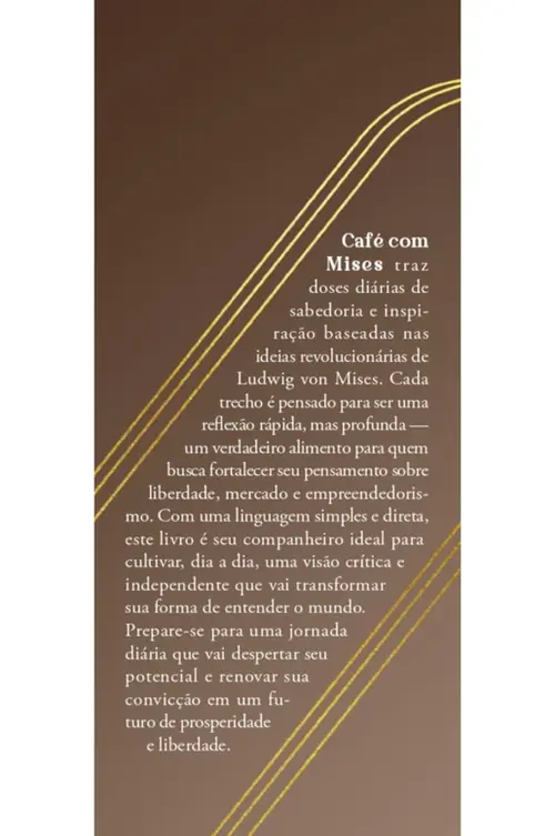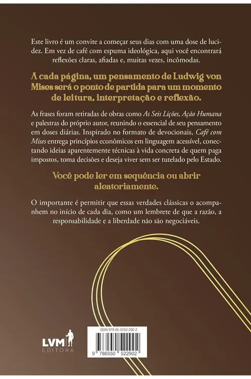 Este livro é um convite para começar seus dias com uma dose de lucidez. Em vez de um café com espuma ideológica, aqui você encontrará reflexões claras, afiadas e, muitas vezes, incômodas. A cada página, um pensamento de Ludwig von Mises será o ponto de partida para um momento de leitura, interpretação e reflexão. As frases foram retiradas de obras como As Seis Lições, Ação Humana e de palestras do próprio autor, reunindo o essencial de seu pensamento em doses diárias.