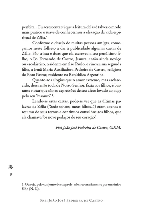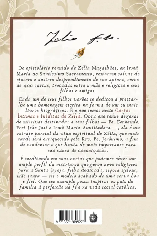 Cada um de seus filhos varões se dedicou a prestar-lhe uma homenagem escrita na forma de um ou mais livros biográficos. É o que temos neste Cartas Íntimas e Inéditas de Zélia. Obra que reúne dezenas de missivas destinadas a seus filhos — Pe. Fernando, Frei João José e Irmã Maria Auxiliadora —, ela é um retrato parcial da vida espiritual de Zélia, que mais tarde será enriquecido pelo Rev. Pe. Jerônimo, a fim de condensar o que havia de mais importante para sua causa de canonização.