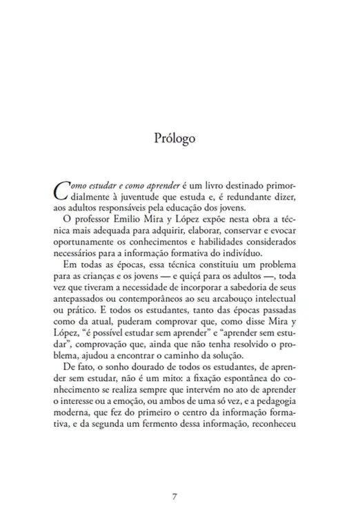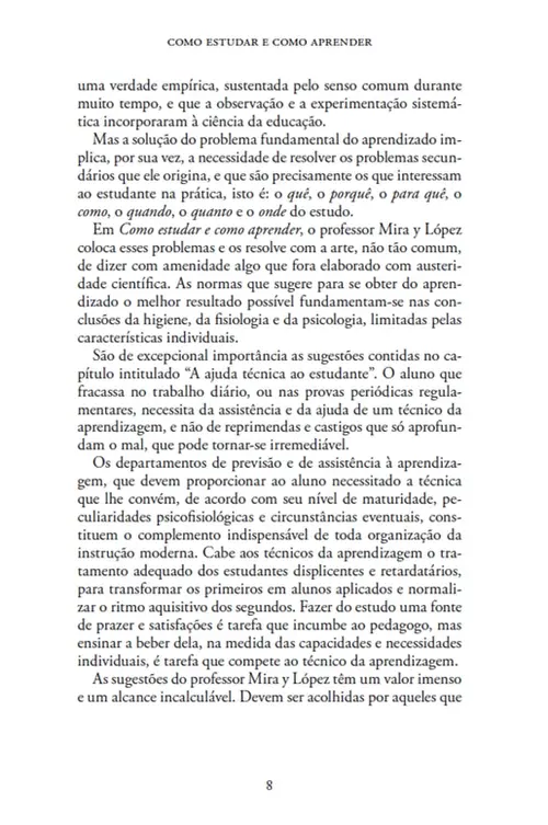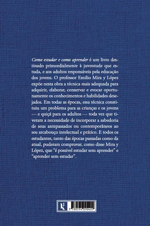 Como estudar e como aprender é um livro destinado primordialmente à juventude que estuda, e aos adultos responsáveis pela educação dos jovens. O professor Emilio Mira y López expõe nesta obra a técnica mais adequada para adquirir, elaborar, conservar e evocar oportunamente os conhecimentos e habilidades desejados. Em todas as épocas, essa técnica constituiu um problema para as crianças e os jovens — e quiçá para os adultos — toda vez que tiveram a necessidade de incorporar a sabedoria de seus antepassados ou contemporâneos ao seu arcabouço intelectual e prático. E todos os estudantes, tanto das épocas passadas como da atual, puderam comprovar, como disse Mira y López, que “é possível estudar sem aprender” e “aprender sem estudar”.