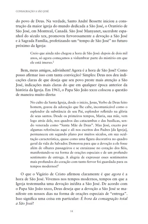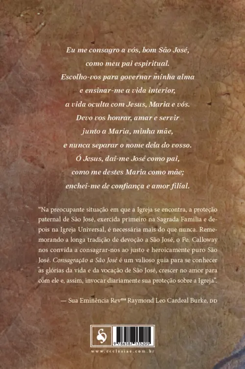 "Na preocupante situação em que a Igreja se encontra, a proteção paternal de São José, exercido primeiro na Sagrada Família e depois na Igreja Universal, é necessária mais do que nunca. Rememorando a longa tradição de devoção a São José, o Pe. Calloway nos convida a consagrar-nos ao justo e heroicamente puro São José. Consagração a São José é um valioso guia para reconhecer as glórias da vida e da devoção de São José, crescer no amor para com ele e, assim, invocar diariamente sua proteção sobre a Igreja".