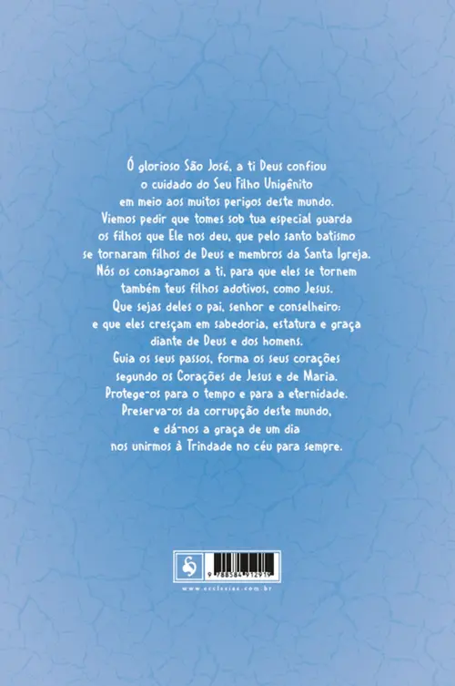 Ó glorioso São José, a ti Deus confiou o cuidado do Seu Filho Unigênito em meio aos muitos perigos deste mundo. Viemos pedir que tomes sob tua especial guarda os filhos que Ele nos deu, que pelo santo batismo se tornaram filhos de Deus e membros da Santa Igreja. Nós os consagramos a ti, para que eles se tornem também teus filhos adotivos, como Jesus. Que sejas deles o pai, senhor e conselheiro; e que eles cresçam em sabedoria, estatura e graça diante de Deus e dos homens. Guia os seus passos, forma os seus corações segundo os Corações de Jesus e de Maria. Protege-os para o tempo e para a eternidade. Preserva-os da corrupção deste mundo, e dá-nos a graça de um dia nos unirmos à Trindade no céu para sempre.