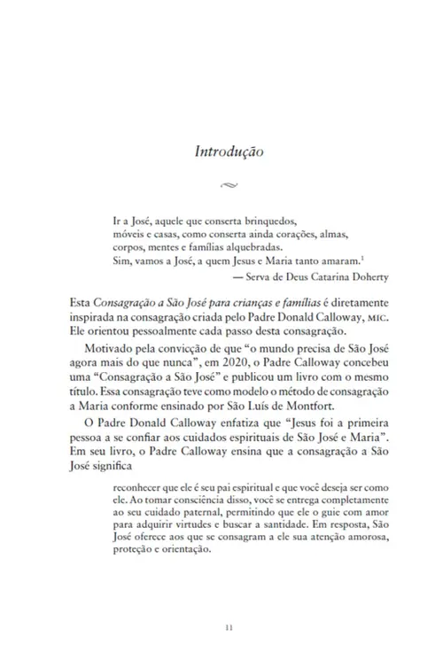 Consagração a São José para Crianças e Famílias é uma obra inspiradora que guia famílias a aprofundarem sua fé e confiança em São José, o pai espiritual de Jesus. Baseado no método consagrado pelo Padre Donald Calloway, este livro adapta os ensinamentos da consagração tradicional de São Luís de Montfort para um público mais jovem, destacando a importância do cuidado paternal e da proteção amorosa de São José. Com uma abordagem acessível e envolvente, a obra convida crianças e adultos a se aproximarem de Deus por meio do exemplo de virtude, humildade e santidade do guardião da Sagrada Família.