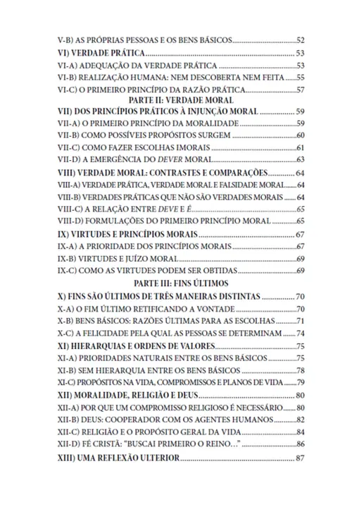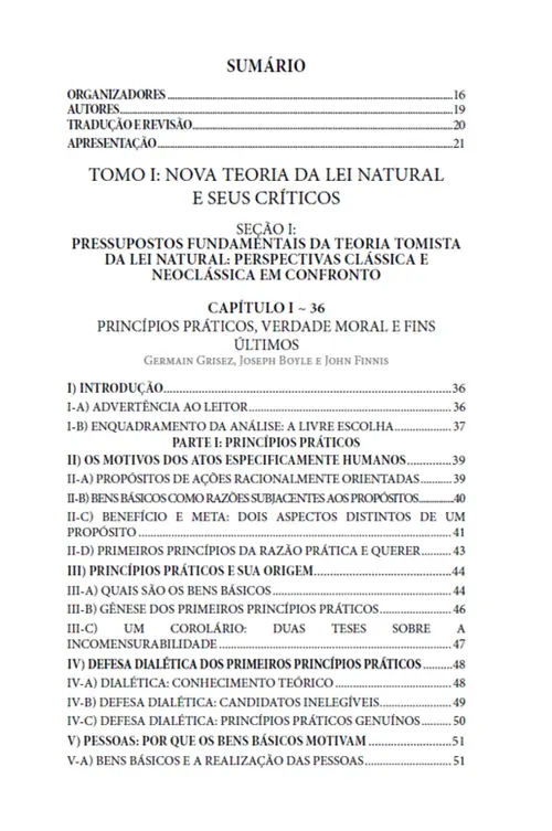O livro inicia, no primeiro tomo, abordando os postulados fundamentais da assim chamada New Natural Law Theory, epicentro dos debates mais recentes no campo do direito natural. Essa “nova” teoria afirma estar inspirada no pensamento de Aquino, mas transita no ambiente da filosofia transcendental e da falácia naturalista, dentro do qual o autêntico pensamento de Santo Tomás é confundido e facilmente perdido de vista.
