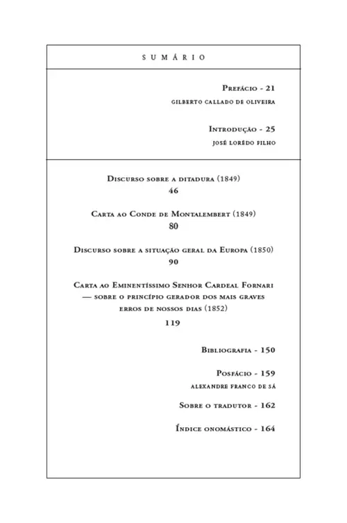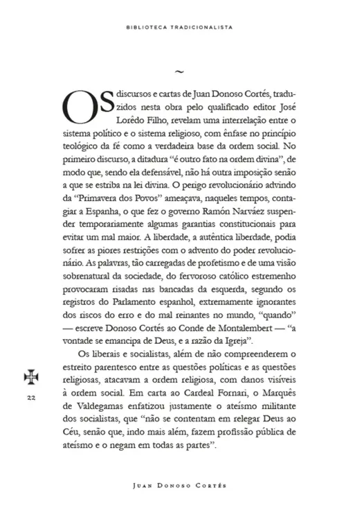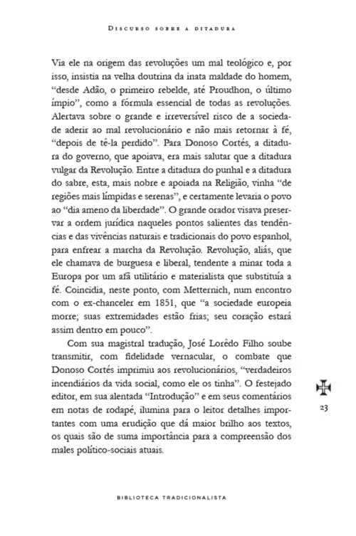 De modo a divulgar entre nós a obra do grande publicista e tribuno espanhol, o presente volume da Biblioteca Tradicionalista reúne alguns de seus mais importantes escritos — o “Discurso sobre a ditadura” (1849), a “Carta ao Conde de Montalembert” (1849), o “Discurso sobre a situação geral da Europa” (1850) e a “Carta ao Eminentíssimo Senhor Cardeal Fornari — sobre o princípio gerador dos mais graves erros de nossos dias” (1852) —, traduzidos e anotados pelo editor José Lorêdo Filho.