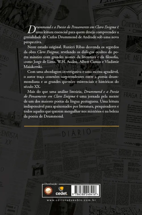 Neste estudo original, Ranieri Ribas desvenda os segredos da obra Claro Enigma, revelando os diálogos ocultos do poeta mineiro com grandes nomes da literatura e da filosofia, como Jorge de Lima, W.H. Auden, Albert Camus e Vladimir Maiakovski.