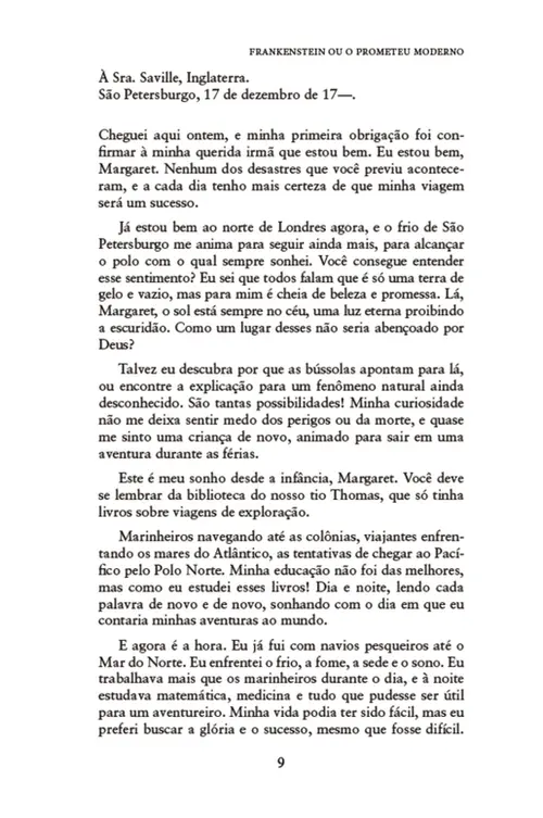 Narrado através das cartas do capitão Robert Walton, que encontra Victor no Ártico, o romance revela a jornada de Frankenstein desde sua infância até a criação da criatura, e as trágicas consequências que se seguem. A criatura, rejeitada por sua aparência, busca vingança contra seu criador, levando ambos a uma perseguição mortal.