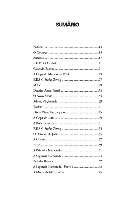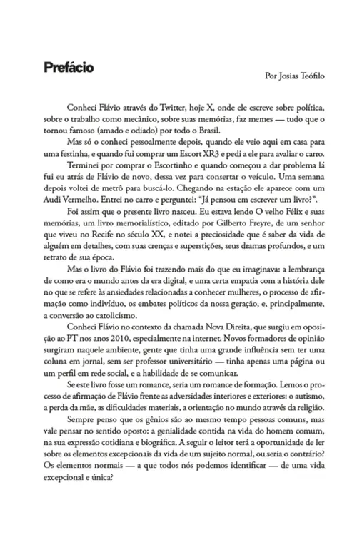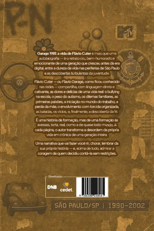 Flávio Cuter — ou Flavio Garage, como ficou conhecido nas redes — compartilha, com linguagem direta e cativante, as dores e delícias de uma vida real: o bullying na escola, o peso do autismo, os dilemas familiares, as primeiras paixões, a iniciação no mundo do trabalho, a perda da mãe, o envolvimento com torcida organizada, as baladas, os vícios, e, finalmente, a descoberta da fé.