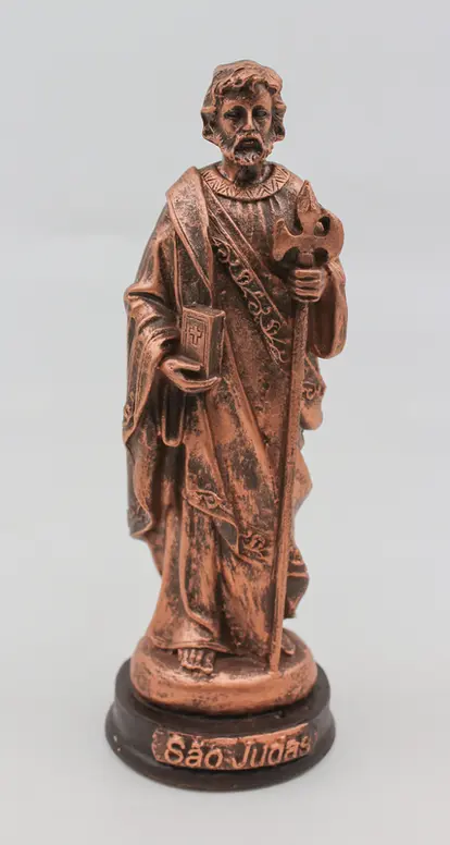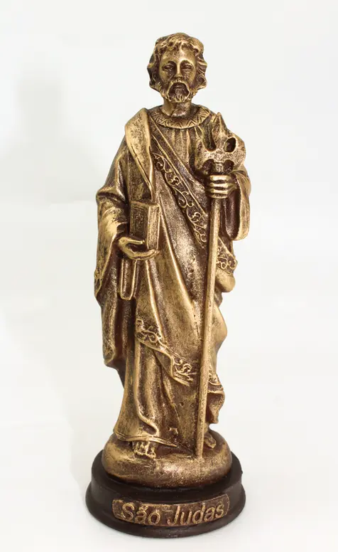 São Judas é representado segurando um machado, uma clava, uma espada ou uma alabarda, por sua morte ter ocorrido por uma dessas armas.