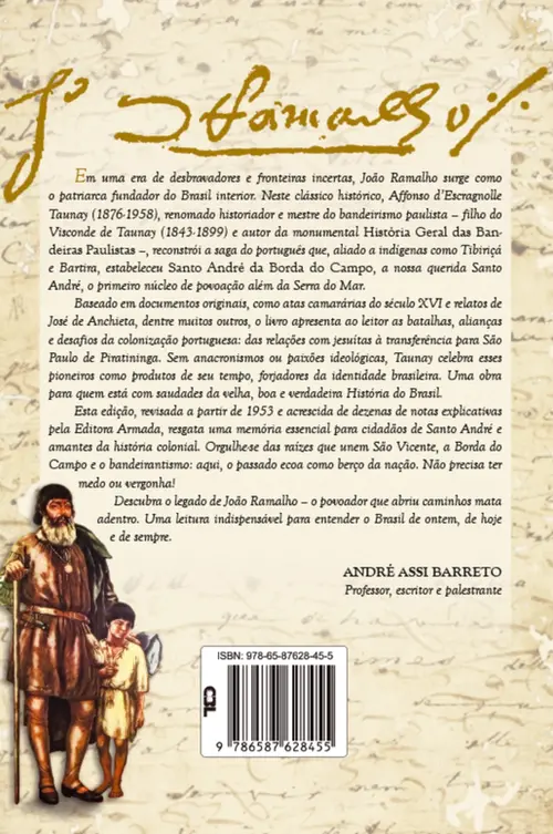 Em uma era de desbravadores e fronteiras incertas, João Ramalho surge como o patriarca fundador do Brasil interior. Neste clássico histórico, Affonso d’Escragnolle Taunay (1876-1958), renomado historiador e mestre do bandeirismo paulista – filho do Visconde de Taunay (1843-1899) e autor da monumental História Geral das Bandeiras Paulistas –, reconstrói a saga do português que, aliado a indígenas como Tibiriçá Bartira, estabeleceu Santo André da Borda do Campo, a nossa querida Santo André, o primeiro núcleo de povoação além da Serra do Mar. Baseado em documentos originais, como atas camarárias do século XVI e relatos de José de Anchieta, dentre muitos outros, o livro apresenta ao leitor as batalhas, alianças e desafios da colonização portuguesa: das relações com jesuítas à transferência para São Paulo de Piratininga. Sem anacronismos ou paixões ideológicas, Taunay celebra esses pioneiros como produtos de seu tempo, forjadores da identidade brasileira. Uma obra para quem está com saudades da velha, boa e verdadeira História do Brasil. Esta edição, revisada a partir de 1953 e acrescida de dezenas de notas explicativas pela Editora Armada, resgata uma memória essencial para cidadãos de Santo André e amantes da história colonial. Orgulhe-se das raízes que unem São Vicente, a Borda do Campo e o bandeirantismo: aqui, o passado ecoa como berço da nação. Não precisa ter medo ou vergonha!