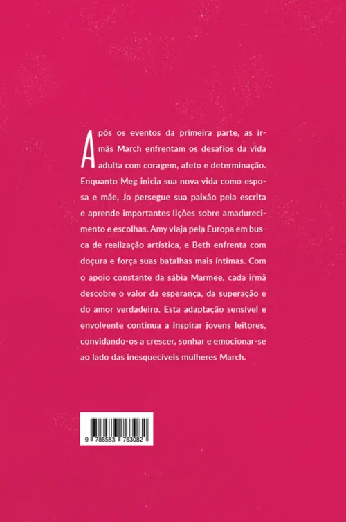 Na continuação da história das irmãs March, Meg, Jo, Beth e Amy enfrentam os desafios da vida adulta com coragem e sensibilidade. Meg lida com a maternidade, Jo busca seu espaço como escritora, Amy viaja em busca de sua vocação artística e Beth enfrenta lutas íntimas com ternura e força. Com o apoio da mãe, Marmee, cada uma descobre lições sobre amor, amadurecimento e esperança. Essa adaptação sensível convida novos leitores a se emocionarem com as transformações e conquistas dessas mulheres inesquecíveis.