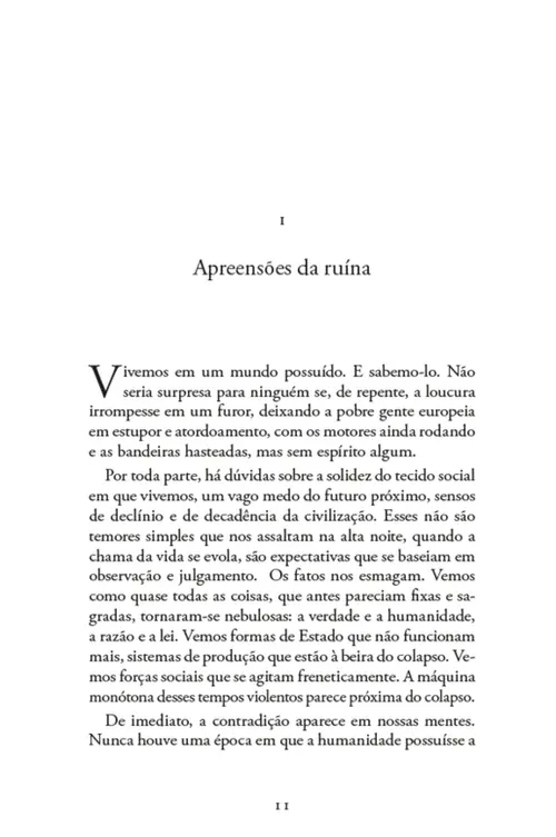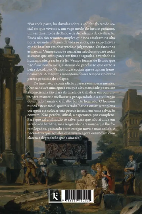 “Por toda parte, há dúvidas sobre a solidez do tecido social em que vivemos, um vago medo do futuro próximo, um sentimento de declínio e de decadência da civilização. Esses não são temores simples que nos assaltam na alta noite, quando a chama da vida se evola, são expectativas que se baseiam em observação e julgamento. Os fatos nos esmagam. Vemos como se tornaram nebulosas quase todas as coisas que antes pareciam fixas e sagradas: a verdade e a humanidade, a razão e a lei. Vemos formas de Estado que não funcionam mais, sistemas de produção que estão à beira do colapso. Vemos forças sociais que se agitam freneticamente. A máquina monótona desses tempos violentos parece próxima do colapso. De imediato, a contradição aparece em nossas mentes. Nunca houve uma época em que a humanidade possuísse a consciência tão clara da tarefa de trabalhar em conjunto para manter e melhorar a prosperidade e a civilização do mundo. Jamais o trabalho foi tão honrado. O homem nunca esteve tão disposto a trabalhar e a ousar, a ter plena coragem e a colocar sua pessoa inteira em uma salvação comum. Não perdeu, afinal, a esperança por completo. Para que tal civilização se salve, para que não afunde em séculos de barbárie, mas resguarde os tesouros que lhe foram legados, passando a um estágio novo e mais sólido, é necessário que aqueles que vivem agora entendam com clareza a degradação que a ameaça”.