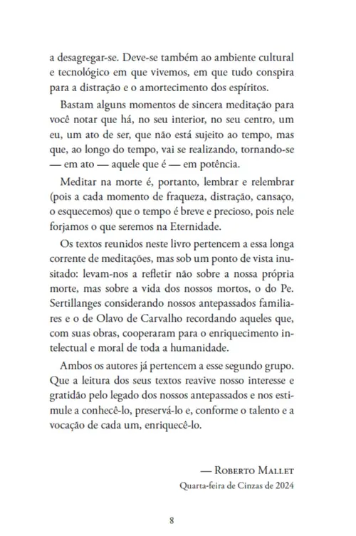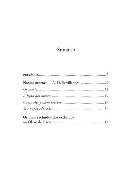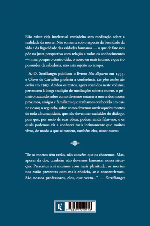 A.-D. Sertillanges publicou o livreto Nos disparus em 1933, e Olavo de Carvalho proferiu a conferência Les plus exclus des exclus em 1997. Ambos os textos, agora reunidos neste volume, pertencem à longa tradição de meditações sobre a morte, o primeiro tratando sobre como devemos encarar a morte dos nossos próximos, amigos e familiares que tenhamos conhecido em carne e osso; o segundo, sobre como devemos ouvir aqueles mortos de toda a humanidade, que não devem ser excluídos do diálogo, pois que, por meio de suas obras, podem ainda falar-nos, e os quais podemos vir a conhecer mais intimamente que muitos vivos, de modo a que se tornem, também eles, nossos mortos.