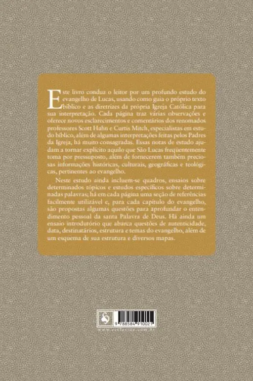 Este livro conduz o leitor por um profundo estudo do evangelho de Lucas, usando como guia o próprio texto bíblico e as diretrizes da própria Igreja Católica para sua interpretação. Cada página traz várias observações e oferece novos esclarecimentos e comentários dos renomados professores Scott Hahn e Curtis Mitch, especialistas em estudo bíblico, além de algumas interpretações feitas pelos Padres da Igreja, há muito consagradas.