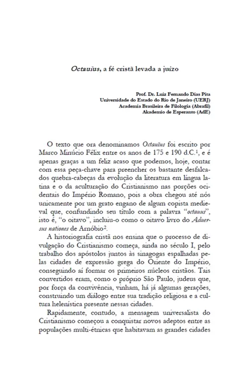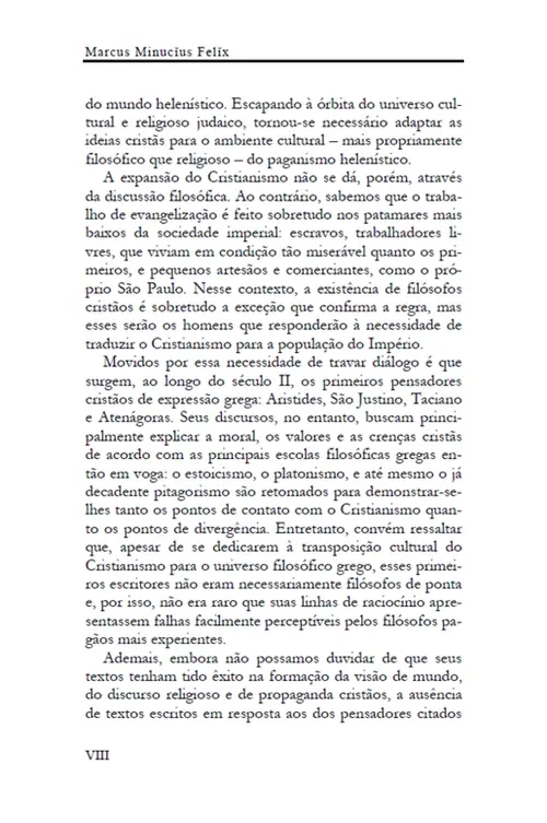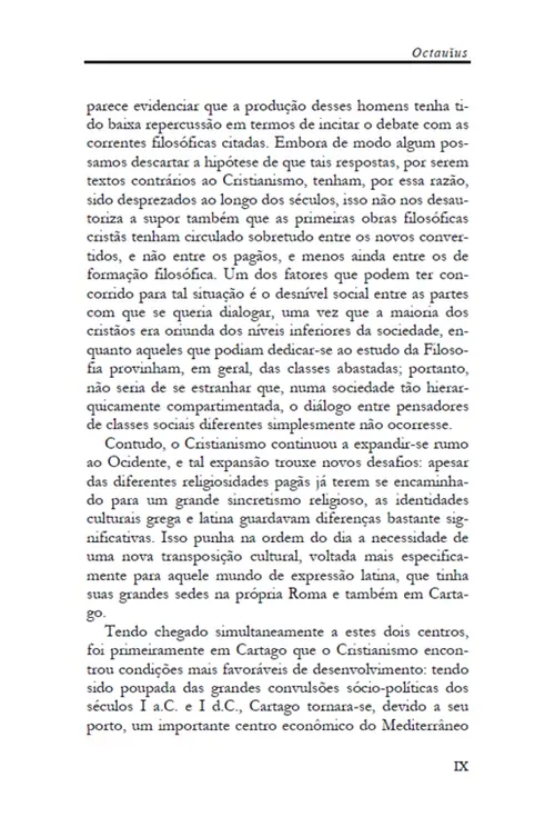 Publicado no fim do século II d.C., Octauius é provavelmente o primeiro texto cristão escrito em latim. Voltado para os habitantes da porção ocidental do Império Romano, sua proposta não é – como se poderia pensar num primeiro momento – apresentar Jesus aos romanos, falar de seus milagres e maravilhas; e muito menos de como um mero carpinteiro representaria o cumprimento das crenças e profecias judaicas em um messias libertador de seu povo. Isso porque nenhum desses argumentos faria muito sentido – se chegasse a fazê-lo – para aqueles cujo universo religioso está firmemente enraizado na mitologia e cultura greco-romanas, às quais hoje denominamos “clássicas”.