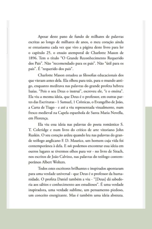 É somente quando reconhecemos nossas limitações que nosso trabalho se torna eficaz: quando vemos definitivamente o que devemos fazer, o que podemos e o que não podemos fazer, quando começamos a trabalhar com confiança e coragem; quando temos um fim em vista e abrimos nosso caminho de maneira inteligente em direção a esse fim, e um caminho para o fim é um método. Cabe aos pais não apenas gerar os filhos para uma vida de inteligência e poder moral, mas sustentar a vida espiritualmente elevada que eles geraram. ”- (Pais e Filhos, Charlotte Mason)