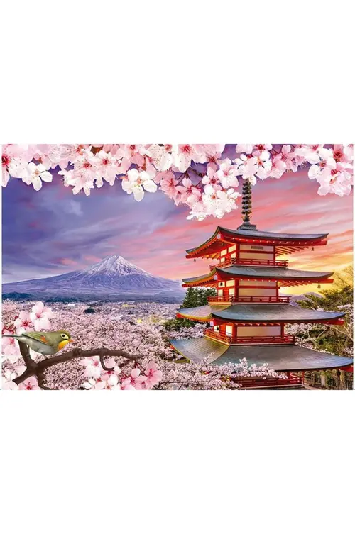 Um cenário sereno e deslumbrante com o tradicional pagode japonês emoldurado por flores de cerejeira e o imponente Monte Fuji ao fundo.
