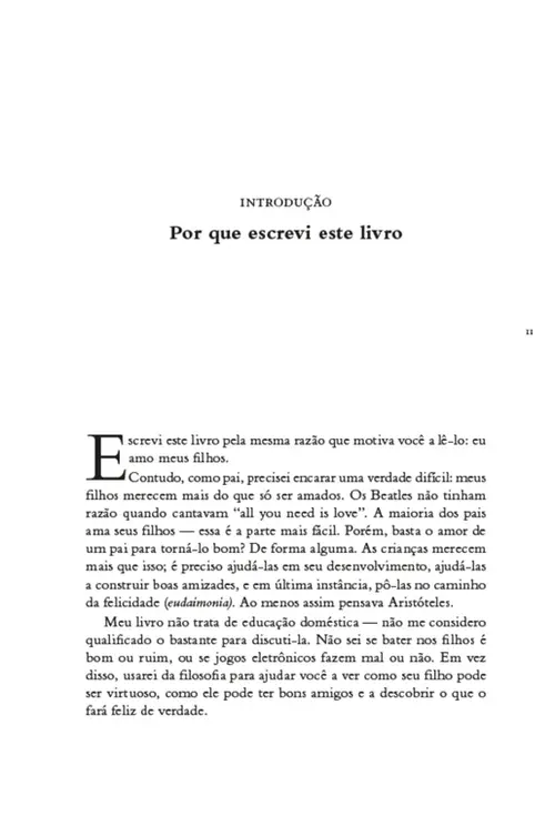 Este é um livro de filosofia para pais, e o que me motivou a escrevê-lo é a mesma coisa que deve motivá-lo a lê-lo: eu amo meus filhos e quero que eles sejam boas pessoas.