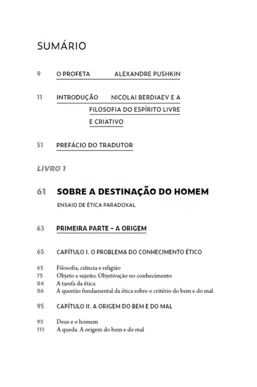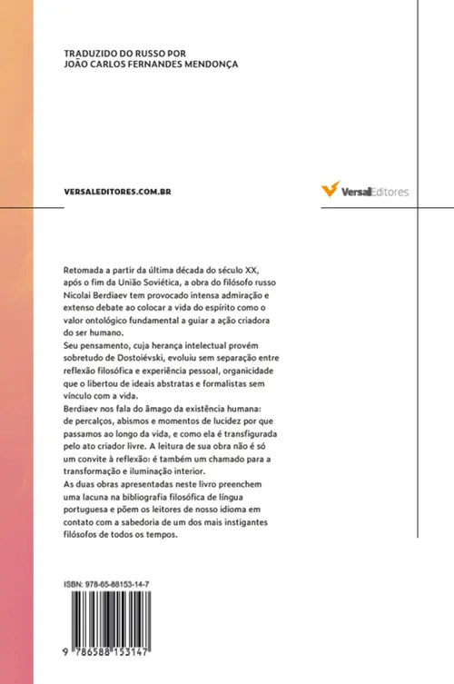 Berdiaev nos fala do âmago da existência humana: de percalços, abismos e momentos de lucidez por que passamos ao longo da vida, e como ela é transfigurada pelo ato criador livre. A leitura de sua obra não é só um convite à reflexão: é também um chamado para a transformação e iluminação interior. As duas obras apresentadas neste livro preenchem uma lacuna na bibliografia filosófica de língua portuguesa e põem os leitores de nosso idioma em contato com a sabedoria de um dos mais instigantes filósofos de todos os tempos.