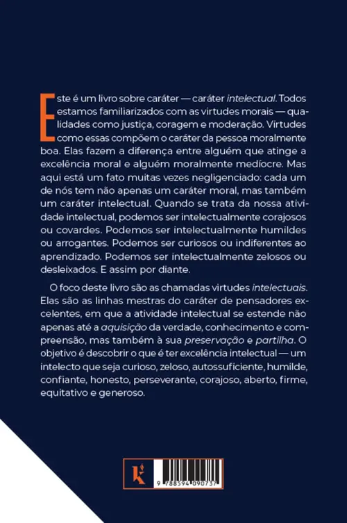 O foco deste livro são as chamadas virtudes intelectuais. Elas são as linhas mestras do caráter de pensadores excelentes, em que a atividade intelectual se estende não apenas até a aquisição da verdade, conhecimento e compreensão, mas também à sua preservação e partilha. O objetivo é descobrir o que é ter excelência intelectual — um intelecto que seja curioso, zeloso, autossuficiente, humilde, confiante, honesto, perseverante, corajoso, aberto, firme, equitativo e generoso.
