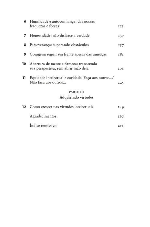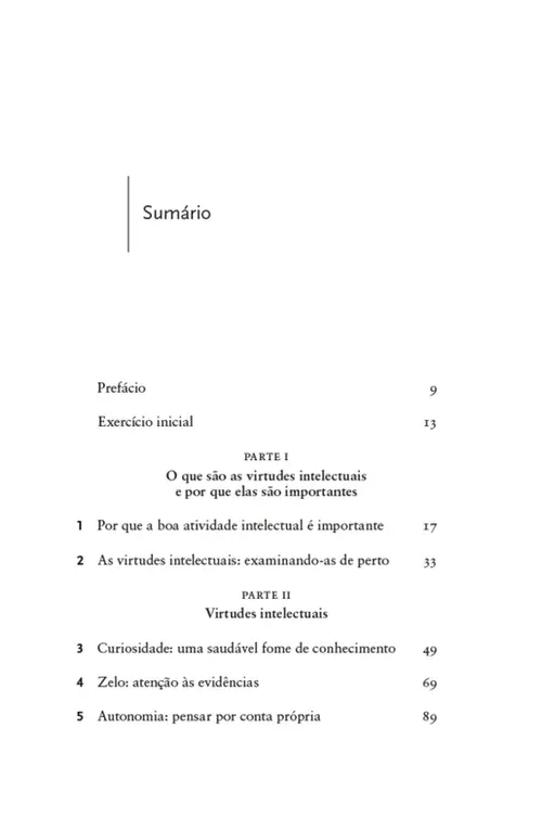 Este é um livro sobre caráter — caráter intelectual. Todos estamos familiarizados com as virtudes morais — qualidades como justiça, coragem e moderação. Virtudes como essas compõem o caráter da pessoa moralmente boa. Elas fazem a diferença entre alguém que atinge a excelência moral e alguém moralmente medíocre. Mas aqui está um fato muitas vezes negligenciado: cada um de nós tem não apenas um caráter moral, mas também um caráter intelectual. Quando se trata da nossa atividade intelectual, podemos ser intelectualmente corajosos ou covardes. Podemos ser intelectualmente humildes ou arrogantes. Podemos ser curiosos ou indiferentes ao aprendizado. Podemos ser intelectualmente zelosos ou desleixados. E assim por diante.
